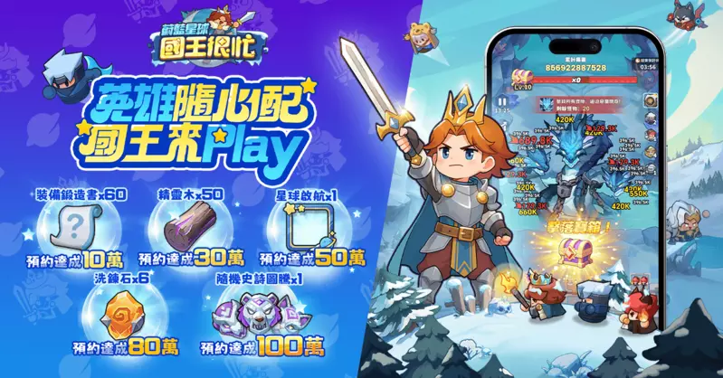 《蔚藍星球:國王很忙》事前登錄活動已正式啟動!成功預約即可在遊戲正式上線後領取豐厚獎勵,包括絕世英雄、幸運777連抽、還有iPhone、iPad Air、Switch等實體好康等你來拿!隨著各位國王的加入,預約活動將解鎖更多精彩好禮,快邀請親朋好友一同開啟這場奇妙冒險吧!