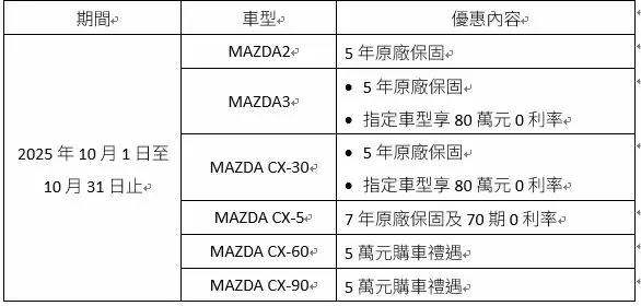 MAZDA 10 月購車優惠專案內容由台灣馬自達與 MAZDA 授權經銷商共同提供,本專案僅適用於 2025 年 10 月 1 日起訂購,並於 2025 年 10 月 31 日前領牌之特定 MAZDA2/ MAZDA3/ CX-30/ CX-5/ CX-60/ CX-90 車型。特定車型享有的「5 年原廠保固」係指⾃領牌⽇起算 3 年或⾥程數達 10 萬公⾥ (以先屆滿者為準) 之新⾞保固期限屆滿後,可再享有 2 年不限⾥程之 MAZDA 延⻑保固;MAZDA CX-5 享有的「7 年原廠保固」,係指⾃領牌⽇起算 3 年或⾥程數達 10 萬公⾥ (以先屆滿者為準) 之新⾞保固期限屆滿後,可再享有 4 年不限⾥程之 MAZDA 延⻑保固,並分為兩階段,第一階段為 4-5 年「全域安心型」延長保固,第二階段為 6-7 年「核心守護型」延長保固。有關 MAZDA 延長保固之注意事項,請參閱台灣馬自達官方網站之「MAZDA 延長保固方案」說明及「MAZDA 延長保固方案權益手冊」。台灣馬自達與 MAZDA 授權經銷商保留專案內容變更及最終解釋之權利,租賃車、大宗批售、優惠批售及計程車等,不適用本專案,更多活動詳情請見台灣馬自達官方網站。