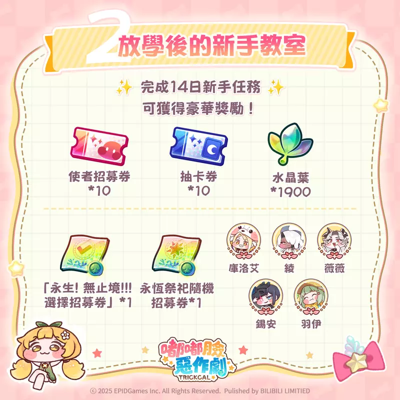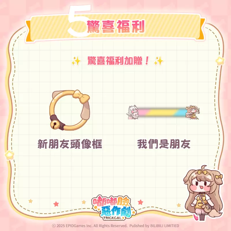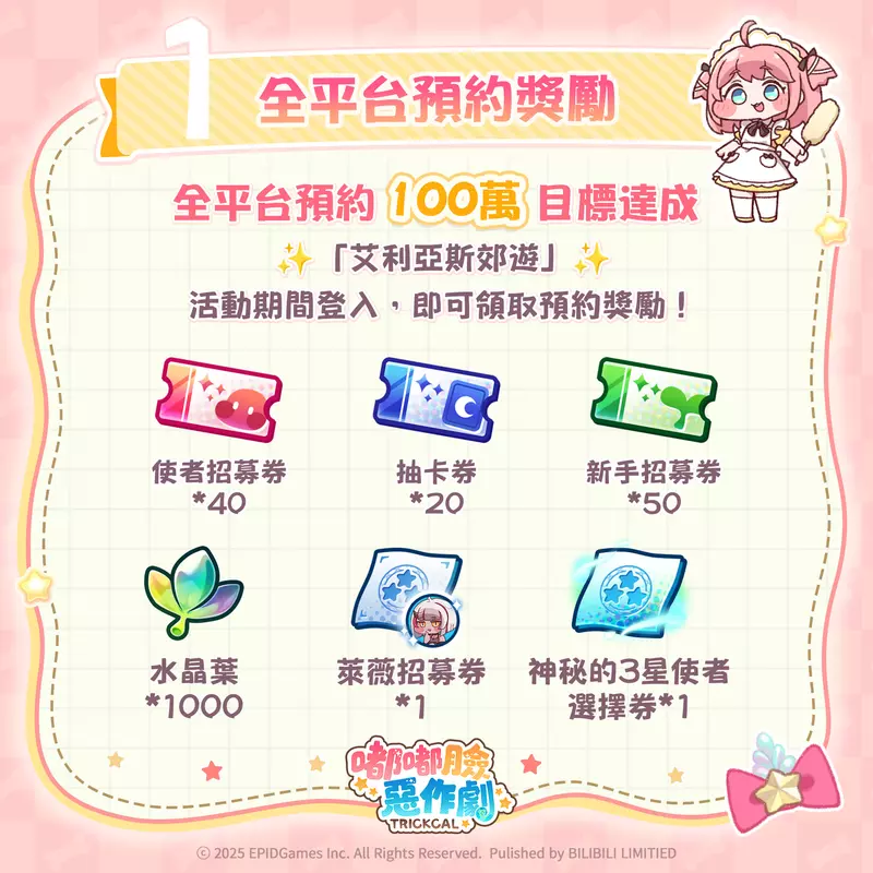 由EPIDGames開發的超休閒紓壓手機遊戲《嘟嘟臉惡作劇》於2025年10月9日,在Android/iOS雙平台正式上架!登入首日可獲得130連抽,同時解鎖多項獎勵,包括預約獎勵★3使者選擇券*2、水晶葉等其他多項遊戲內道具,甚至有機會參與可獲得iPhone 17的抽獎活動!此外,為了紀念遊戲正式上線,由遊戲內角色真心獻唱的可愛主題曲也將在10/9正式發布啦!快來艾利亞斯展開全新冒險吧!
