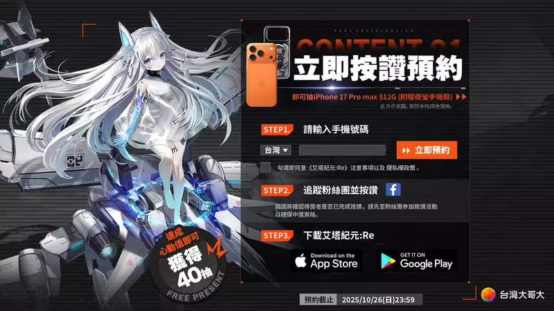 為慶祝台灣大哥大正式代理《艾塔紀元:Re》,特別推出誠意滿滿的事前預約活動。