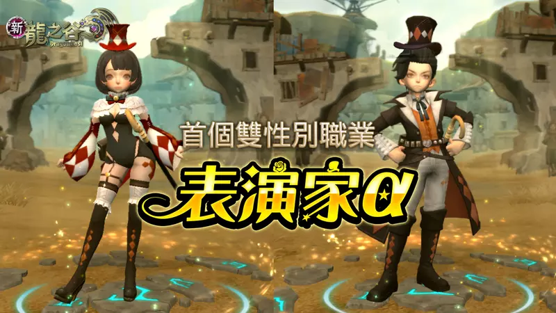 《新龍之谷》推出首款可自由選擇性別的職業「表演家α」,讓冒險者依喜好打造專屬舞台風格。「表演家α」以主武器「閃耀魔杖」與副武器「派對包」出戰,可釋放如「雜耍」、「光彩彈跳」等炫目技能;進階一轉「舞台藝術家」及二轉「卡牌戲法師」後,更能施展「氣球漂浮」升空、「榔頭砰砰」猛擊敵方,以及召喚超大旋轉木馬席捲戰場,將戰鬥變成一場魔幻舞台秀。
