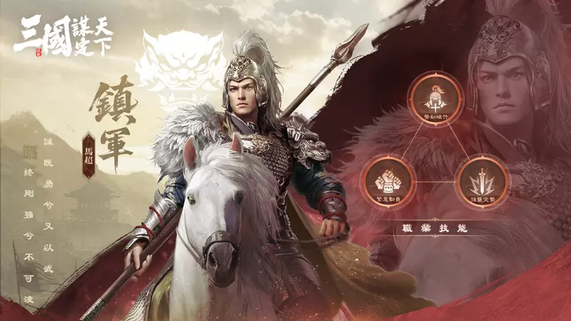 職業-鎮軍:以正面作戰為核心,擅長攻城與衝鋒陷陣。能快速補兵、提升士氣,是戰場上最具爆發力的主戰職業。其技能可快速動員、主動進攻以及消耗敵軍、並在勝利後迅速壯大兵力,非常適合帶領部隊打正面衝突、資源爭奪戰、城池攻防戰等高強度戰役。