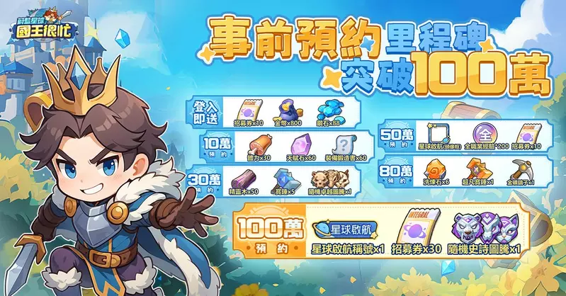 官方宣布《蔚藍星球:國王很忙》事前預約人數已突破 100 萬,達成全檔位獎勵目標。為感謝廣大玩家的關注與支持,現在登入即可於【英雄手禮】中領取(包含招募券、鑽石、專屬頭像框與稱號在內)的多項獎勵!