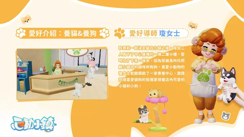 小鎮的中心廣場上有著瓊女士經營的【寵物之家】,裡面每天都有可愛的小貓和小狗等待發展家領養。【不同的貓咪和狗狗有著不同的性格】,或是黏人,或是獨立,選擇與你最性情相投的小夥伴吧。將貓狗領養回家後,發展家可以餵食、摸摸,或是教牠們許多有趣又可愛的【動作】,隨著養貓與養狗愛好等級提升,能夠領養的貓咪和狗狗數量也會增多,小寵物們每天也會為發展家準備【小禮物】哦~