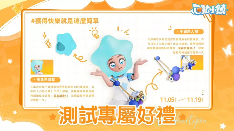 由心動公司研發的慢節奏生活模擬遊戲《心動小鎮》今(5)日展開【首次封閉測試】,在本次測試活動中完成前置任務,簽到7日就送「白色小轎車」,完成「新發展家生活日誌」任務還能獲得「橘子套裝」。除此之外,本次測試達到指定等級的發展家,即可在正式上線後獲得「星星頭套」以及「藍莓側背包」等外觀造型,讓發展家在開服就有眾多時裝搭配,有車又有房,在小鎮生活更加游刃有餘!