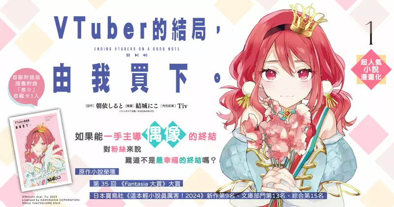 與乃亞共度的每一刻,無論是投入的金錢、時間,還是熱情參與粉絲聚會,主角‧業始終全心全意地支持著她。一同朝夢想前進的路上,眼看距離理想越來越近——卻在某天,乃亞的前世真實身份被揭露,引發大規模炎上。面對突如其來的風波與乃亞的引退,業陷入深深的自責與痛苦之中。失去了最愛的推後,被留下的粉絲,又該如何面對這份空白與現實呢──?《VTuber的結局,由我買下。》第1集首刷附錄版隨書附贈「推☆」收藏卡1張,特別採用向日本申請的珍貴圖像製作。本作已於11/3正式上市,喜愛VTuber題材的讀者們,千萬別錯過囉!