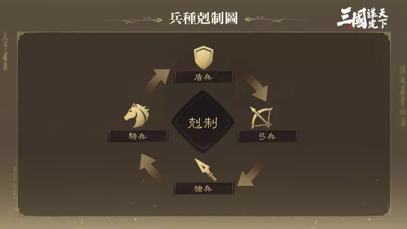 《三國:謀定天下》為每位武將量身打造專屬兵種設定,捨棄市面上其他SLG複雜的適性數值與繁瑣搭配,回歸最直覺、最純粹的戰場剋制邏輯。遊戲內建立「盾剋弓、弓剋槍、槍剋騎、騎剋盾」的經典兵種循環,讓玩家能夠迅速理解並靈活運用戰術優劣勢。再搭配屬性相剋與列傳羈絆等進階系統,使每一場戰鬥都充滿變化與深度,策略家們需依據戰局與對手調整部隊組合,方能在瞬息萬變的沙盤中謀定勝局。