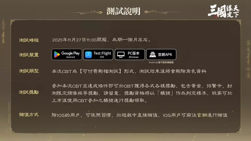本次「帷幄測試」將預計於11月27日(四)上午11:00正式開服。屆時玩家可透過Google Play、App Store、PC版及官方APK 四種平台自由下載體驗。同時在「帷幄測試」賽季中,主公們將能率先體驗多項豐富多樣的遊戲內容,從職業養成、策略對戰到賽季劇本挑戰,盡享完整SLG謀略樂趣。機會難得,切勿錯過這場智謀與權謀交織的策略盛宴!