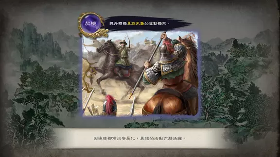 即將發生的「轉機」可隨時確認,但若同時存在多個候選項目,實際會發生哪一種「轉機」,只有在發生的當下才會揭曉。因此,如何鎖定想要引發的「轉機」,並為此提前擬定對策,正是玩家展現實力的關鍵。「轉機」的種類多樣,例如讓多座都市同時出現異民族駐紮的「異族來襲」,以及讓多座都市的部隊同時出征的「決戰」等。隨著這些「轉機」的發生,戰局將瞬間迎來劇烈變化。