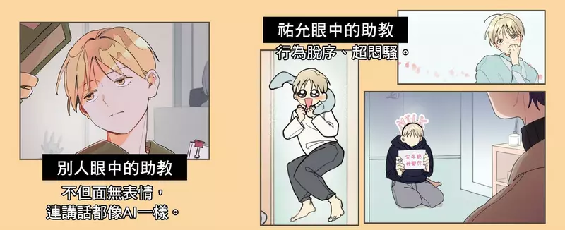 真炯助教在大學裡總是面無表情,也不多話,也從不提起任何私事。他看起來不擅與他人相處,對什麼事都提不起勁,總是一副很無聊的樣子,彷彿獨自一人活在自己的世界……但是在套房裡的助教,卻是個會做出脫序行為、腦中有各種奇怪妄想、平板內有大量大尺度BL漫、行動完全無法預測的「怪人」!而即使真炯內外反差極大,祐允仍然喜愛著他,全盤接受各種面貌的真炯,並珍惜著只有自己看得到的「助教大人」!