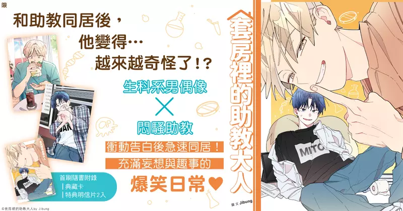 悶騷助教和生科系男偶像充滿妄想的同居生活!Jibung(지붕)老師的《套房裡的助教大人》第1集已於11/19上市,首刷附錄版包含紫界書系定番的典藏卡及特別申請的特典明信片2張,推薦給所有喜歡BL的讀者們!♥♥♥