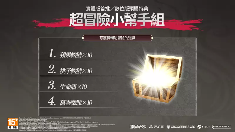 首批購買實體版或預購數位版的玩家將可獲得包含軟糖及生命瓶等回復道具的特典「超冒險小幫手組」。