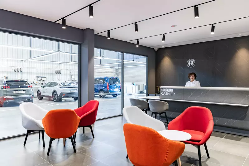 以超過 900 坪的寬敞場域,打造從展示、維修到交車全流程的一站式高規格體驗。展示空間以精品設計呈現 Alfa Romeo、CITROËN、Jeep、PEUGEOT 四大品牌的獨立展示區,利用光影、材質與場景配置強化各品牌風格,使消費者得以沉浸式方式感受四種截然不同的品牌文化。服務廠則導入原廠認證的診斷系統、進口頂車機與專屬維修工位,以符合原廠高標準規格提供專業且高效率的維修技術;同時,客休區設置透明維修視窗,讓車主能以公開透明的方式安心觀察整個作業流程。此外,「台中旗艦品牌中心」設置超過 315 坪的專屬停車區,提供充足且便利的停車空間,讓消費者在賞車與返廠動線上更加順暢無虞。