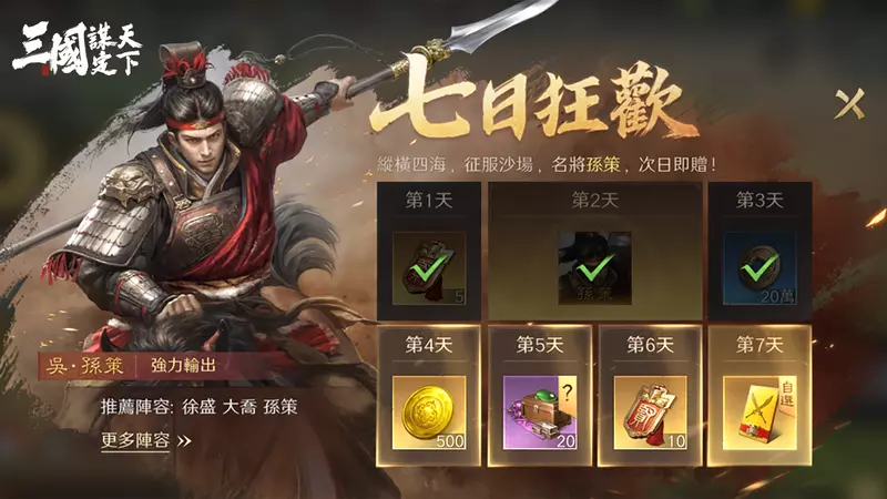 主公創角後立即開啟,第二日即可獲得開荒強力武將-橙將孫策。每日登入還可領取包括求賢令、銅幣、黃金、打造材料等核心資源,幫助主公迅速提升戰力。