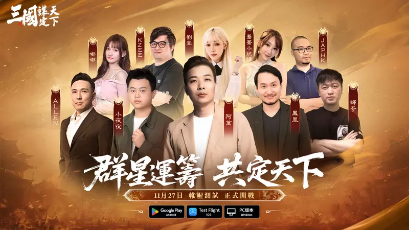 《三國:謀定天下》宣布遊戲將於11 月 27 日上午11:00正式啟動 「可付費限量刪檔測試」(CBT),並於今日同步開放預先下載,「帷幄測試」即將進入最後倒數。本次封測將提供多項豐富福利與活動,參與封測的主公們可透過賽季內容結交戰友、生死與共,並且還能於公測上市時,取得封測期間限定頭像框的專屬獎勵! 《三國:謀定天下》同時邀請多位知名實況主參與此次封測活動,封測期間將連袂主公們一同酣戰沙場,協助主公更全面了解遊戲特色與玩法。