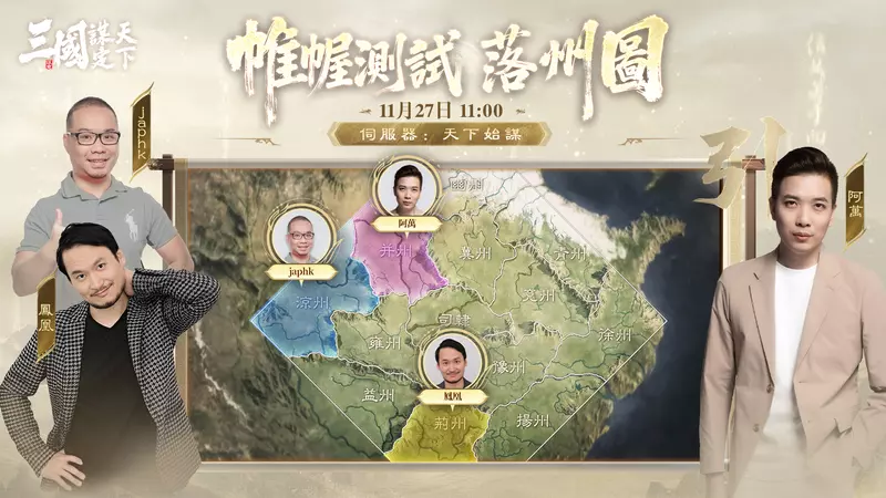 多位熟悉 SLG 類型的實況高手將在本次封測期間持續開播,包括阿萬、鳳凰、輝哥、蕎蕎小妃姬、Allen、嘟嘟等人氣實況主,都將與主公一同踏上《三國:謀定天下》的宏大沙盤戰場。
