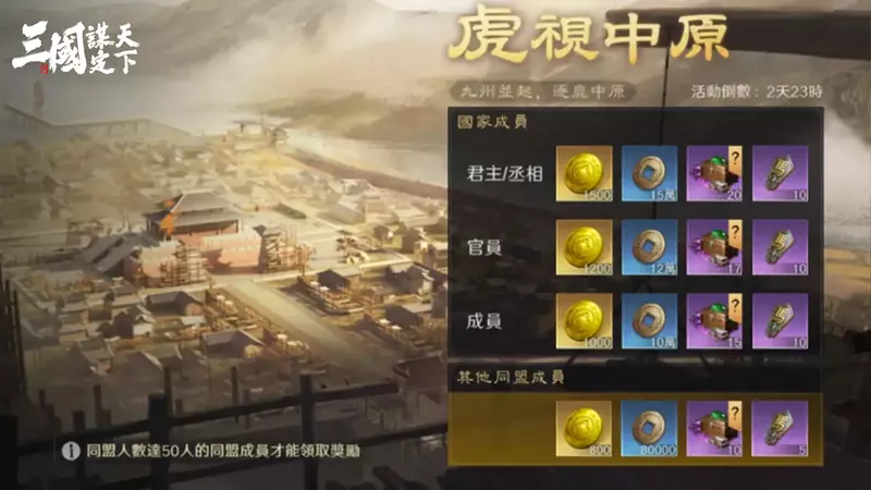 開服第 3 天中午 12 點開啟,需同盟滿 50 人方可領取獎勵。依主公在國家中的職位,將可獲得高額黃金、銅幣與上品打造材料箱,為前期同盟競爭注入更強動能。