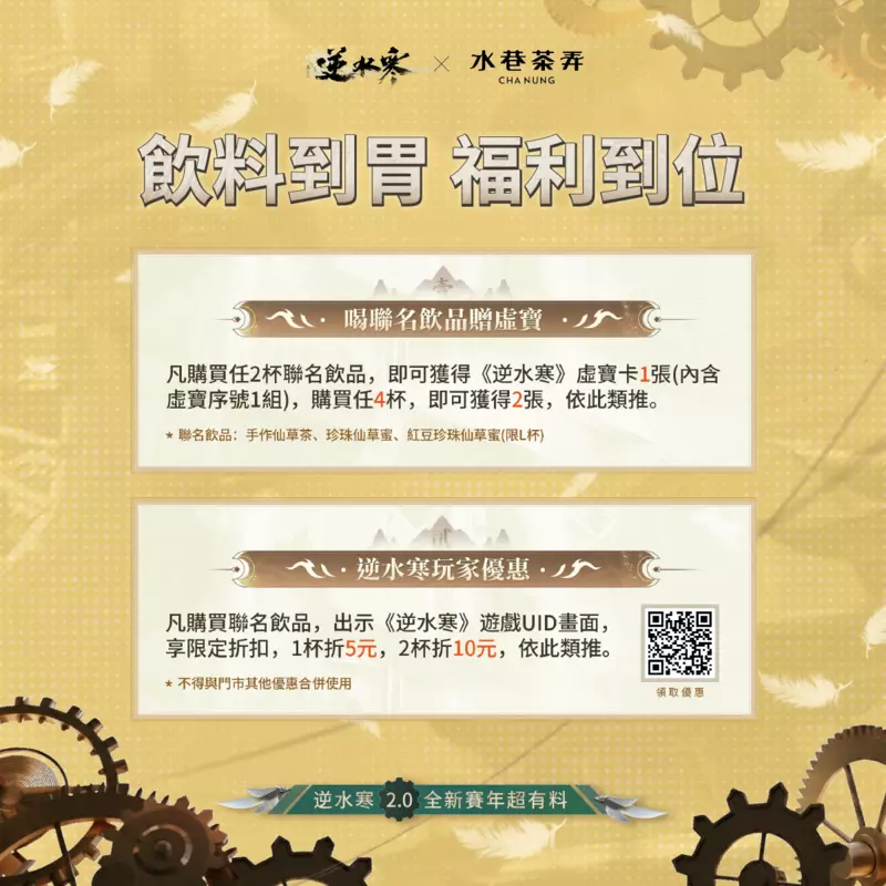 為回饋同門支持,《逆水寒》推出「手搖天賞:30 天飲料自由」活動。即日起,只要參加線上任務並上傳玄機聯名杯身照片,即可抽中 連喝一個月的水巷茶弄飲料兌換券。FB 與 IG 各抽出一位幸運玩家,詳情請見活動貼文: