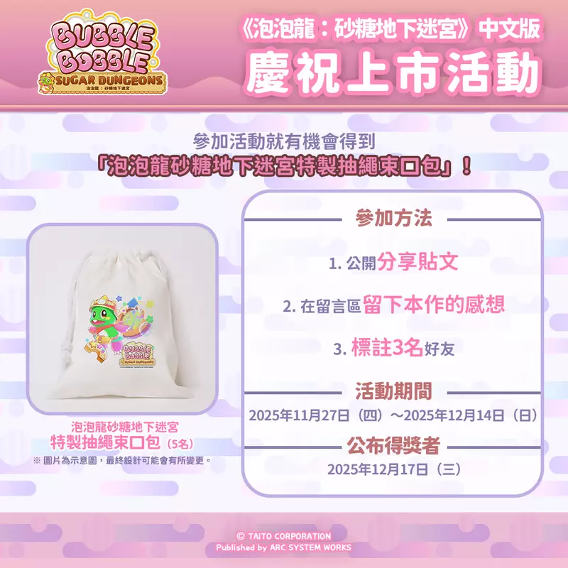 為慶祝《泡泡龍:砂糖地下迷宮》中文版上市,從今天起舉辦抽獎活動。公開分享活動貼文並在留言區留下關於本作的感想,就有機會得到「泡泡龍砂糖地下迷宮特製抽繩束口包」。抽獎活動詳情如下。