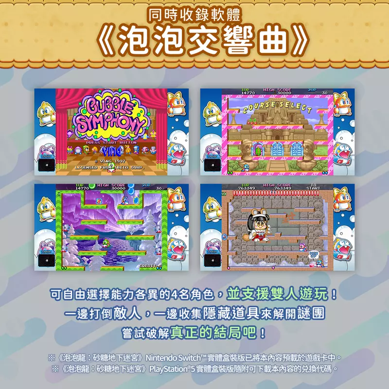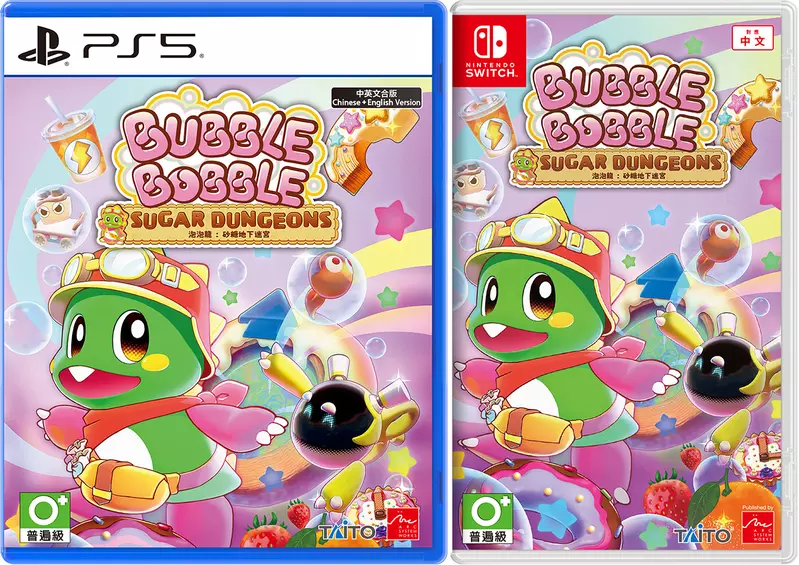 TAITO公司的動作遊戲《泡泡龍:砂糖地下迷宮》中文實體盒裝版(Nintendo Switch™、PlayStation®5)與數位下載版(Nintendo Switch™、PlayStation®5、Steam®)已於(27日)正式上市。內含數位原聲帶與數位美術集的豪華版也一併發售。