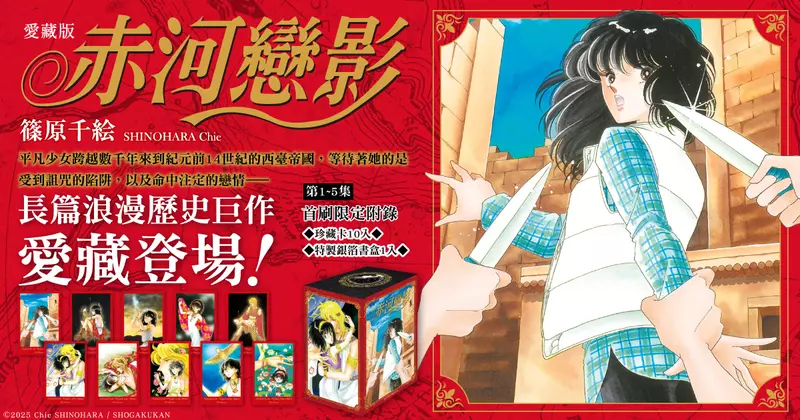 而今年,《赤河戀影》以愛藏版的形式重新推出,依照小學館在2006年至2007年發行的愛藏版版本編排,由原先的28集單行本編製為16冊,將分為「第1-5集」、「第6-10集」與「第11-16集」三盒出版。作為新版本,愛藏版將以32K的大小印製,重新設計了封面與封底,每個書盒也使用特殊銀箔紙質製成並搭配精緻彩圖設計,每盒還會附上以精緻插畫製成的特典明信片10入(第11-16集則是12入),對於新接觸或是想回味的讀者來說,都是非常值得收藏的版本!