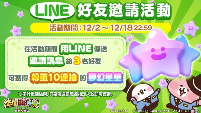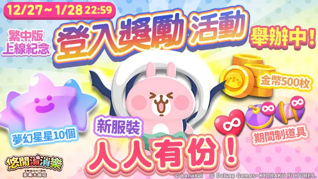 不僅如此,為了慶祝盛大上線更推出了許多獎勵活動。只要登入就可以獲得虛擬寶物與新服裝的獎勵;用LINE傳送邀請訊息給3名好友,更可以獲得夢幻星星轉蛋10連抽!透過故事通關就有機會獲得不同道具,限定期間內破到故事3-1更可以獲得SR咖啡廳制服造型的敬語兔兔!