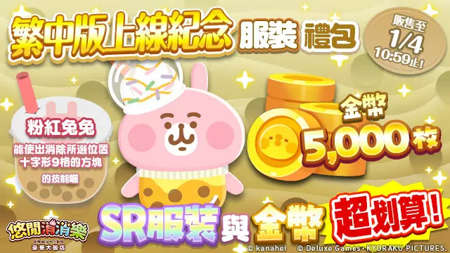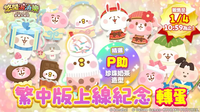 為慶祝繁中版本的推出,《悠閒消消樂 卡娜赫拉的小動物 豪華大飯店》遊戲官方更推出了獨家「P助與粉紅兔兔 珍珠奶茶服裝」,一定要收藏!「粉紅兔兔 珍珠奶茶服裝」只要透過購買服裝禮包即可獲得;「P助 珍珠奶茶服裝」,則有機會透過轉蛋獲得!期間限定務必把握機會參加!