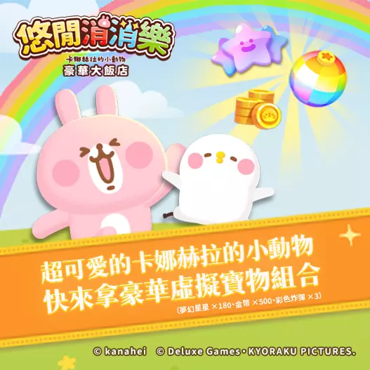 「卡娜赫拉的小動物」日本原作授權的全新消除類休閒遊戲《悠閒消消樂 卡娜赫拉的小動物 豪華大飯店》正式登場!可愛魅力席捲全台,迷倒千萬粉絲的《卡娜赫拉的小動物》在手機上開設專屬飯店啦!繁體中文版於12月2日正式上線,玩家們終於能與「P助與粉紅兔兔」等熟悉角色一起打造專屬的夢幻大飯店,展開療癒滿點的遊戲體驗。喜歡《卡娜赫拉的小動物》的粉絲及熱愛消除類休閒遊戲的玩家千萬別錯過!