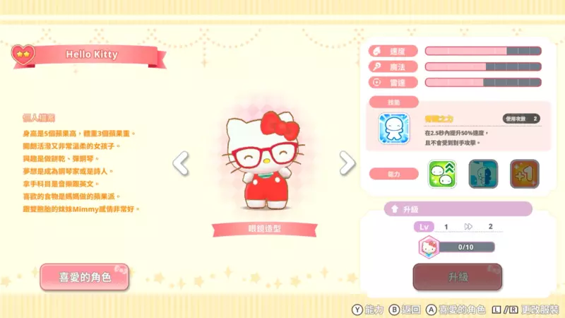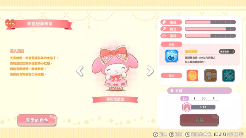 另外還可以在遊戲中的「商店」替角色們更換衣服,例如幫Hello Kitty戴上時髦的眼鏡,或是讓美樂蒂穿上漂亮的晚禮服等。而能夠將喜愛的角色打扮成自己喜歡的造型,也是本遊戲的魅力之一。