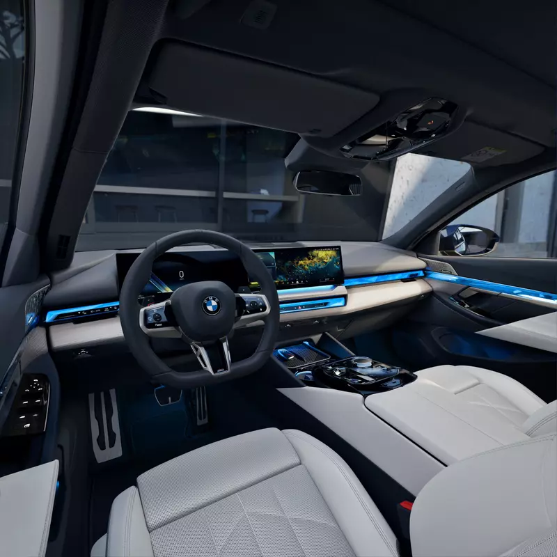 此次,全新年式BMW 520i M Sport Sedan與Touring更同步進行全面升級,標配獨一無二的 BMW 飾光水箱護罩,於夜間行駛時以更銳利且富層次的光影表現,進一步強化車頭張力,搭配經典 C 柱 Hofmeister Kink 與專屬「5」字樣識別,塑造更具辨識度的動感跑格;流線優雅的車側則首次導入動態迎賓光毯,以旗艦級禮賓規格迎接車主,展現豪華細節臻於新境。