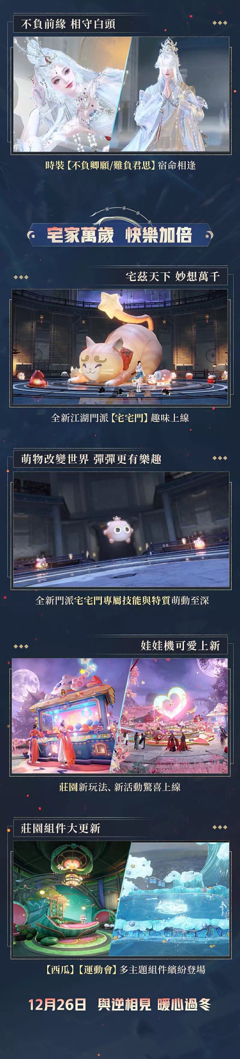 「休閒躺平派」也能快樂享受,全新門派「宅宅門」。主打創意萌趣,透過萌物與彈力機制,趣味性十足。此外,莊園系統也更新多款各式組件,讓不想出門的玩家也能在遊戲中愜意宅家,享受最 Chill 的遊戲時光。