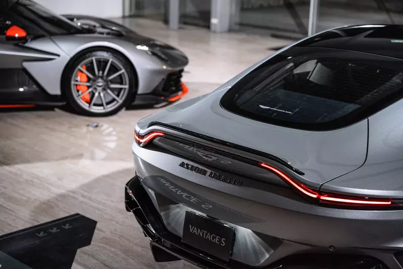 本次 Vantage S 展示車選配 Inspire Sport 匠心真皮運動內裝,以頂級全真皮包覆,採 Dark Knight 色調呈現。人字飾紋結合細緻打孔工藝,勾勒出鮮明的速度意象,營造極具張力的駕駛氛圍。外觀則搭配 Q by Aston Martin 特製 Titanium Silver 鈦銀色車色,為品牌新加入的專屬色彩,在不同光線下展現銀粉光澤與隱約的藍色底蘊,層次豐富且極具辨識度,並與 Vantage S 標配的亮黑色上層外觀套件相互輝映,完整詮釋其性能與質感兼具的設計理念。