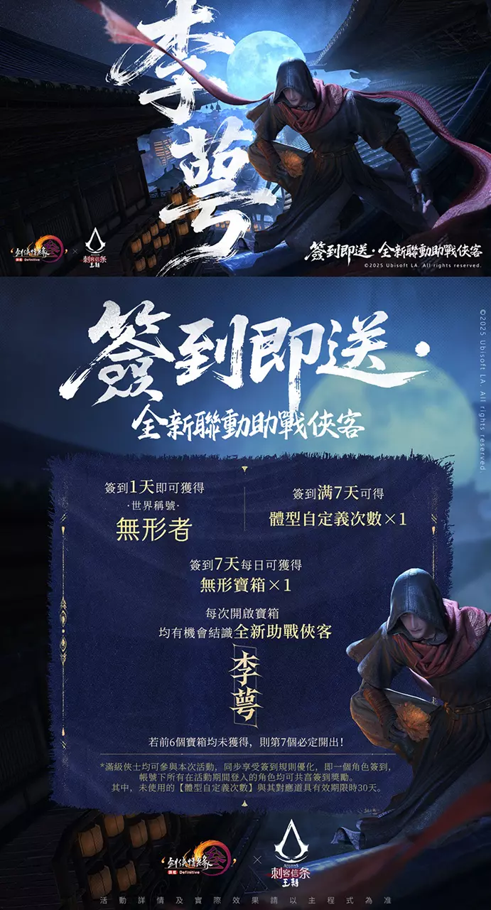 兵法有雲,形兵之極,至於無形,無形則深間不能窺,智者不能謀。全新助戰俠客「李萼」現身,期待俠士共同體會「無形者」的精神追求與獨特魅力!暗夜潛蹤影難覓,利刃閃處罪惡息,身陷囹圄之時,何人能勘破死局?聯動主題簽到活動已熱烈展開,全新聯動稱號與體型自定義次數等好禮也已登場,簽到七天保底送助戰俠客「李萼」!