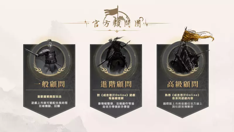 官方甄選採公開透明原則:依報名者遊戲資歷與對《成吉思汗》IP遊戲熟悉程度,招募各層級遊戲顧問,公開合作方式除按件計酬外,也提供長期合作的項目,有興趣靠遊戲實力斜槓打工的玩家們,可以前往特設網頁了解!