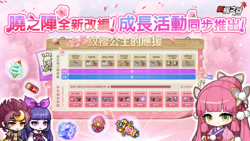 為曉之陣改編霸氣應援,紀念活動「紋櫻公主的應援」火熱登場!即日起至2月24日創建新曉之陣角色,並使用之完成特定養成目標即可解鎖「罕見徽章箱」、「超越成長的秘藥」等道具;擊敗指定等級怪物達標,還可獲得「迷你紋櫻寵物組合包」、「曉之陣白髮/白眼券選擇券」等豐盛獎勵。此外,開放「究極燃燒MAX 1+4」讓Lv.260前之角色享有等級1+4成長,「究極燃燒BEYOND」則可於Lv.260後持續升級至Lv.270等,讓冒險與戰力急速進化。