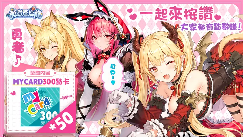 活動期間,只要邀請好友一起為指定活動貼文點讚,雙方皆有機會獲得官方送出的MyCard 300點點數卡哦!官方將從參與玩家中抽50位幸運得主,中獎率超高,快一起揪團參加吧!