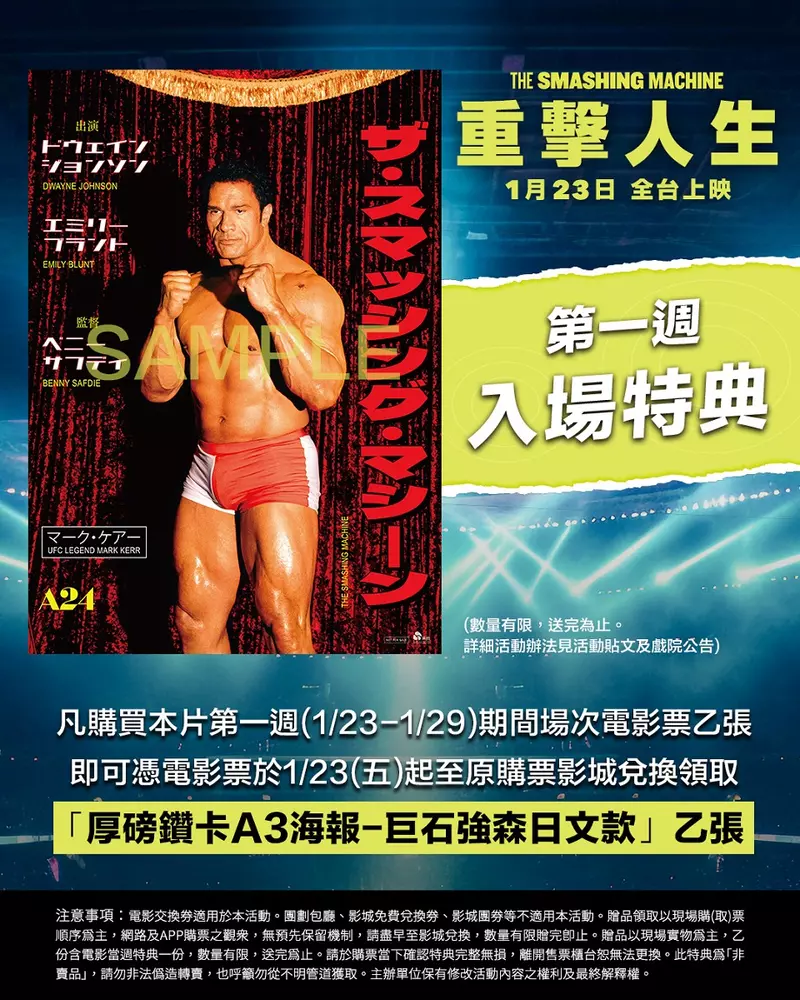 這部改編真人真事,由「金獎製造機」A24重磅出品,巨石強森與艾蜜莉布朗共同主演,並強勢問鼎本屆金球獎「戲劇類最佳男主角」與「最佳女配角」雙料提名的《重擊人生》,即將在1月23日於全台隆重獻映。本片劇情描述在1990年代的格鬥世界裡,馬克克爾(巨石強森飾演)以毀天滅地的爆發力橫掃擂台,被全球奉為無人可敵的「粉碎機」。為了延續傳奇,馬克與頂尖選手們受邀遠赴日本,在更殘酷的戰場上尋求下一場勝利。然而,真正擊垮他的並非對手,而是「永遠必須最強」的壓力。這份重擔不僅吞噬他的生活,也撕裂他與女友道恩(艾蜜莉布朗飾演)的關係。爭吵、失控、心碎不斷上演,愛與人生在拳頭之外被擊得支離破碎。身心崩裂的他,為了再度站上擂台,只能依賴麻醉藥撐住破碎的身體,也一步步陷入藥物成癮的深淵。直到一場慘烈的敗北,讓他的名聲崩塌、感情破碎、人生全面瓦解。他再次透過麻醉藥逃避現實,卻因為藥物注射過量倒下,陷入死亡邊緣。此刻,他必須重新面對自我,是被這場毀滅徹底吞沒?還是重新站起,再戰一場比任何比賽都更加殘酷的「反擊人生」?欲知本片最新消息,請上電影官方臉書粉絲團與Instagram專頁及Threads專頁查詢。
