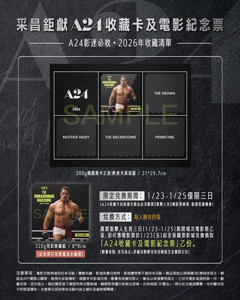 值得一提的是,台灣片商也驚喜推出A24影迷必收的「首三日限定特典」,只要購買本片首三日(1/23至1/25)期間場次電影票乙張,即可憑電影票在1/23(五)起至原購票影城兌換「采昌A24收藏卡及電影紀念票」乙份,尤其A24收藏卡僅可經由購買本片電影票換得,敬請把握機會!此外,片商更祭出首週戲院特典「厚磅鑽卡A3海報–巨石強森日文款」,凡購買第一週(1/23至1/29)期間場次電影票乙張,即可憑電影票於1/23(五)起至原購票影城兌換。多樣精美特典活動,請台灣觀眾千萬不要錯過!活動詳請請見采昌官方社群公告。