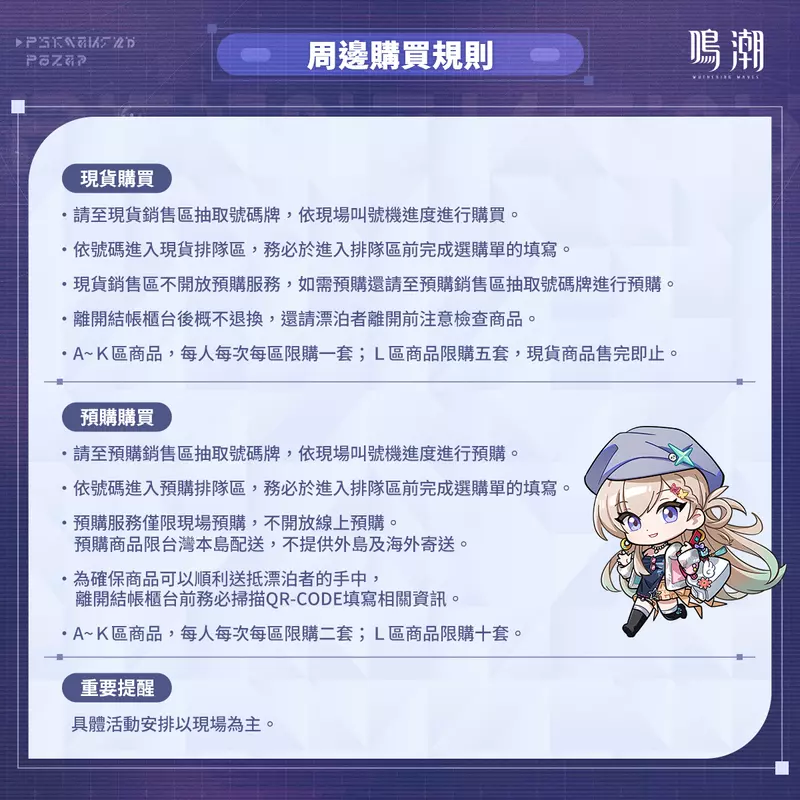 - A~K區商品,每人每次每區限購一套;L區商品限購五套,現貨商品售完即止。