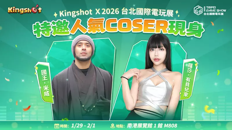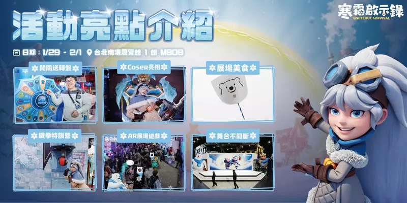 展覽期間,還有青春無敵舞團「New Seasons」與活力四射的「活力寶貝」超洗腦舞曲表演,以及 4名Coser 分別扮演《寒霜啟示錄》茉莉、布蘭琪,與《Kingshot》國王、羅莎等待與玩家見面。誠摯邀請所有玩家蒞臨攤位,一起享受現場活動與豐富好禮!