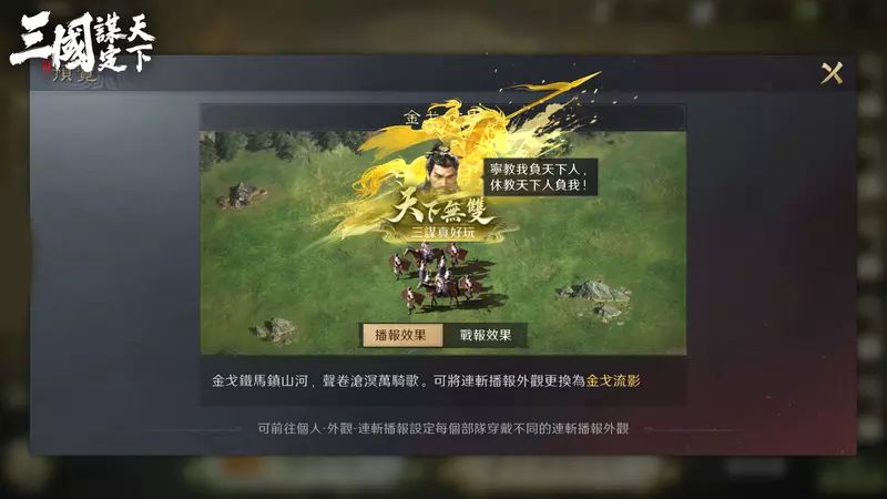 ▼斬播報特效「金戈流影」與「戰八方」戰法特效展示