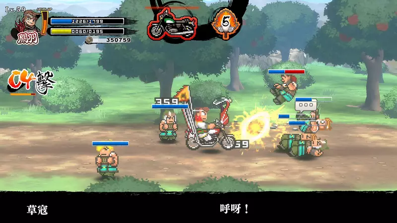 可以乘坐「赤兔馬(摩托車)」在各關卡間移動。不須多言就把途中出現的敵人揍飛吧!拿到專用配件就可以打造「赤兔馬」!隨心所欲地改造赤兔馬吧!另外,如果達成某種條件,「赤兔馬」也有可能會進化成除了「摩托車」以外的坐騎!?