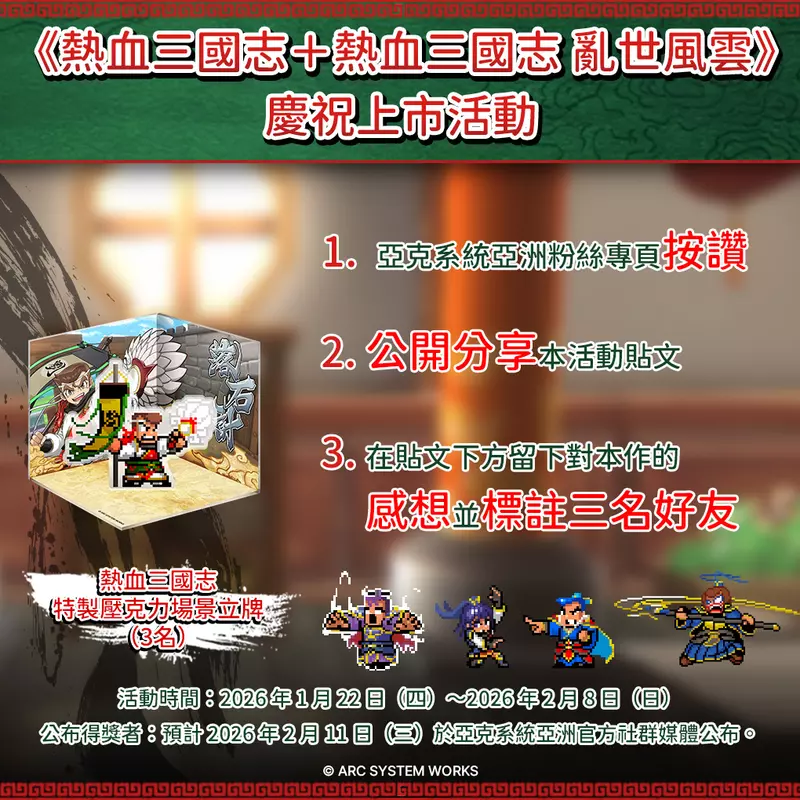 為慶祝《熱血三國志+熱血三國志 亂世風雲》中文實體盒裝版上市,從今天起舉辦抽獎活動。公開分享活動貼文並在留言區留下關於本作的感想,就有機會得到「熱血三國志特製壓克力場景立牌」。