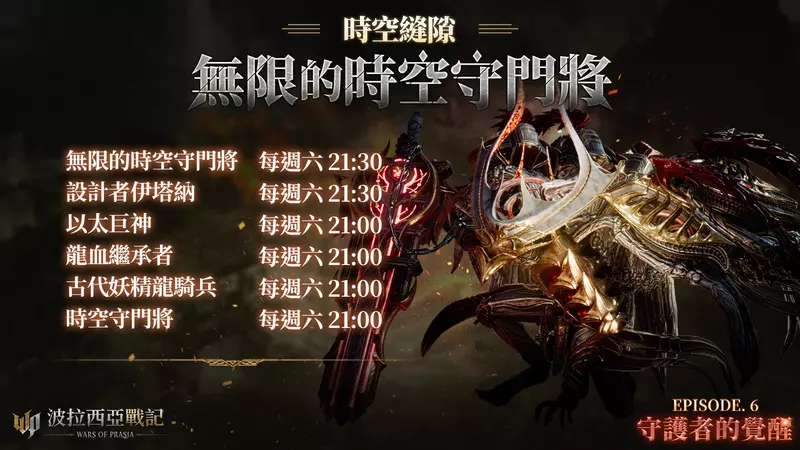 跨服覺醒首領「無限的時空守門將」震撼現身!首度結合「覺醒」與「跨服」雙重機制,為戰場最頂級首領怪物。不同於以往需累積擊殺次數才能召喚的設計,「無限的時空守門將」將於指定時段、地點現身,成功討伐就可機率獲得神話亞奎殘片,更有「傳承:設計者的戒律」與「PVP神話亞奎殘片」等高階材料掉落。強者集結、爭奪戰一觸即發。