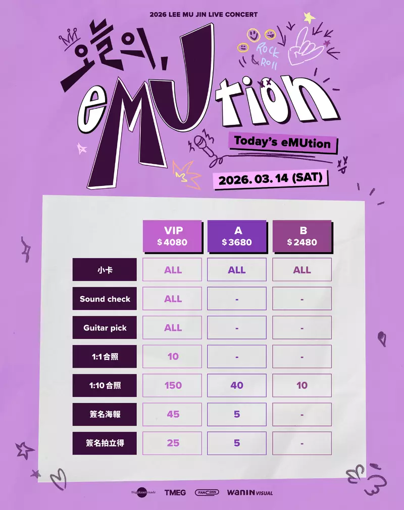 韓國人氣歌手李茂珍去年首度來台,對熱情粉絲與用心的應援留下深刻印象,(5日)正式宣布將特別選在3月14日舉辦他的第二次個人演唱會《2026 LEE MU JIN LIVE CONCERT [Today’s, eMUtion] in TAIPEI》,與粉絲浪漫共度白色情人節,演唱會票價依區域劃分為NT$4080、NT$3680、NT$2480,粉絲福利則是全場粉絲都能獲得台北場限定小卡,VIP區粉絲開放Soundcheck、Guitar pick,依照各區票價不同,可再抽1對1合照、1對10合照、簽名海報、簽名拍立得。演唱會門票將於2月11日中午12點在KKTIX售票網站開賣。