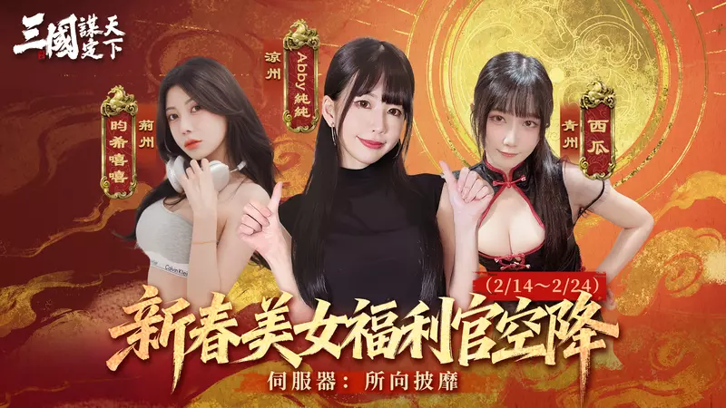 此外,春節期間更推出「美女福利官賀歲企劃」,邀請三位美女實況主昀希嘻嘻、Abby純純、西瓜於2月14日加開「所向披靡」新春賀歲伺服器中直播帶團陪伴主公歡度佳節,與全服玩家一同迎春開戰,共譜新歲霸業新篇章。