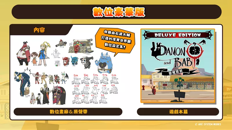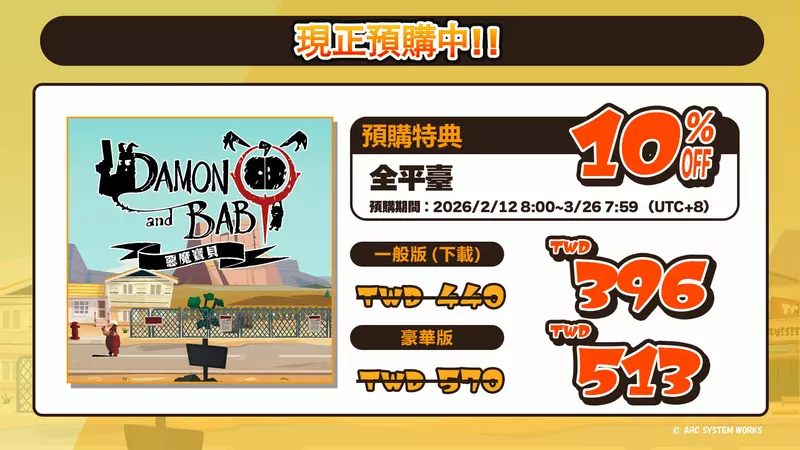 亞克系統亞洲(ARC SYSTEM WORKS ASIA) 宣布,PlayStation®5、PlayStation®4、Nintendo Switch™及Steam®平臺的俯視視角射擊動作冒險遊戲《惡魔寶貝》(DAMON and BABY) 數位下載版於今日開放預購,此外,豪華版確定將於 2026 年 3 月 26 日(四)推出,並預計自 2 月 20 日起發布Steam 先行體驗版。