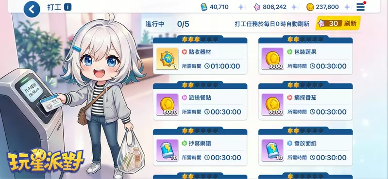 《玩星派對》全新「打工系統」正式登場,開創角色養成之外的全新玩法維度。玩家可自由組合最多4名角色組隊出任務,角色屬性數值越高,獲得額外報酬的成功率就越大,讓每位角色都能發揮最大價值。打工任務每日自動刷新,並設有期間限定的限時任務供玩家把握機會,完成任務必定獲得基本報酬,並有機會額外解鎖豐富好禮,讓玩家的角色隨時都在為你努力!