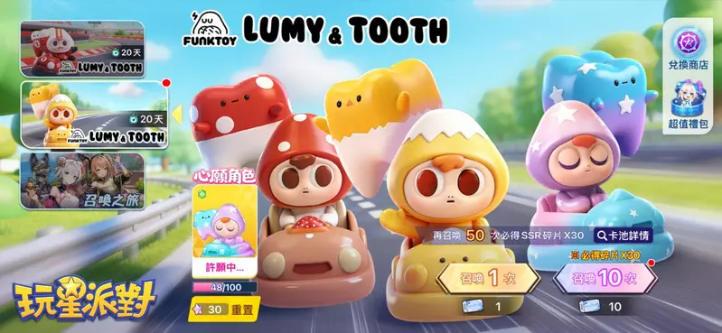 《玩星派對》全新聯動「LUMY&TOOTH嚕米小汽車×牙牙家族」正式登場。「LUMYCAR嚕米小汽車」以台灣玩具設計品牌FUNK TOY放克玩具創作的療癒系角色蘑菇男孩LUMY(嚕米)為主角——外型頭戴蘑菇帽、擁有巨大雙眼,形象安靜孤單中帶有陪伴感,深受收藏玩家喜愛。此次LUMY載著好夥伴牙牙與朋友們踩下油門、以超萌姿態疾馳,帶來結合速度與夢幻的競速冒險!