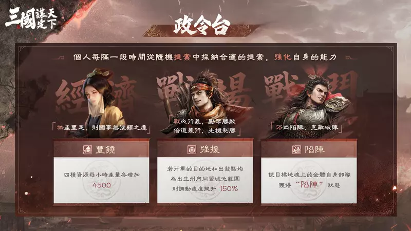 通過政令台,主公可以靈活搭配政令以提升自身的綜合能力,從發展速度到戰鬥策略,豐富了遊戲的策略深度,也增加了遊戲的變化和樂趣,需要玩家根據不同的戰況和策略進行合適的選擇,讓每場戰鬥都充滿了未知和挑戰。